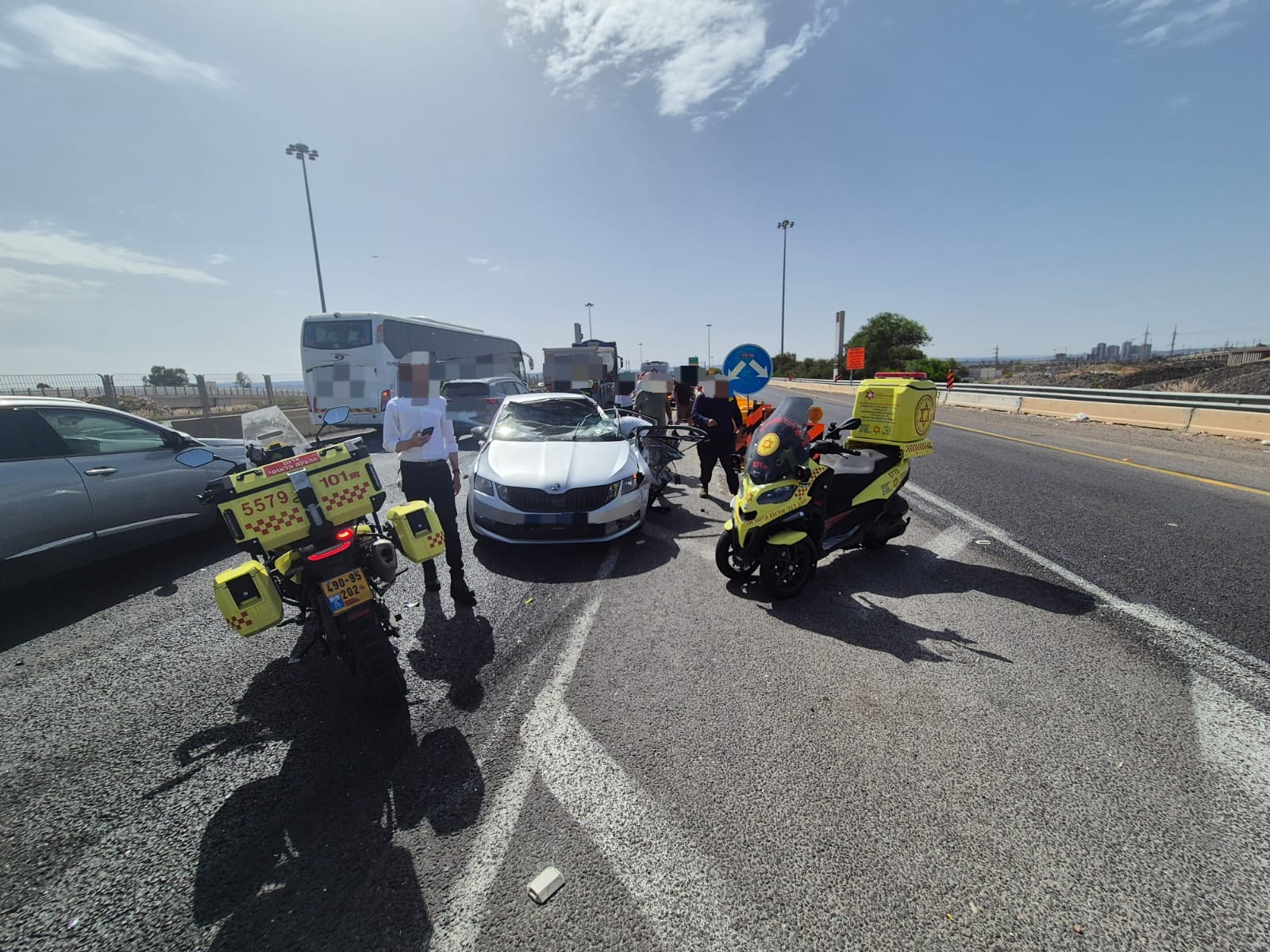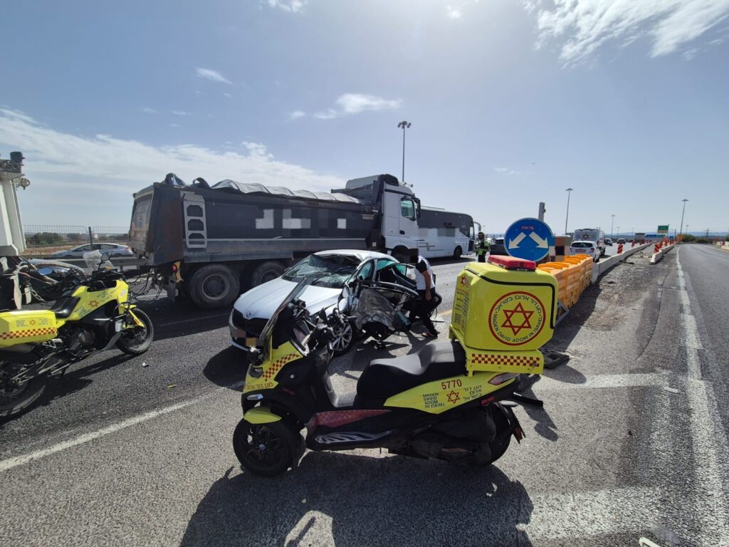 הבוקר [שלישי] התקבל דיווח במוקד 101 של מד"א במרחב איילון על תאונת דרכים בין אוטובוס, משאית ו-3 רכבים פרטיים בכביש 1 סמוך למחלף לוד.