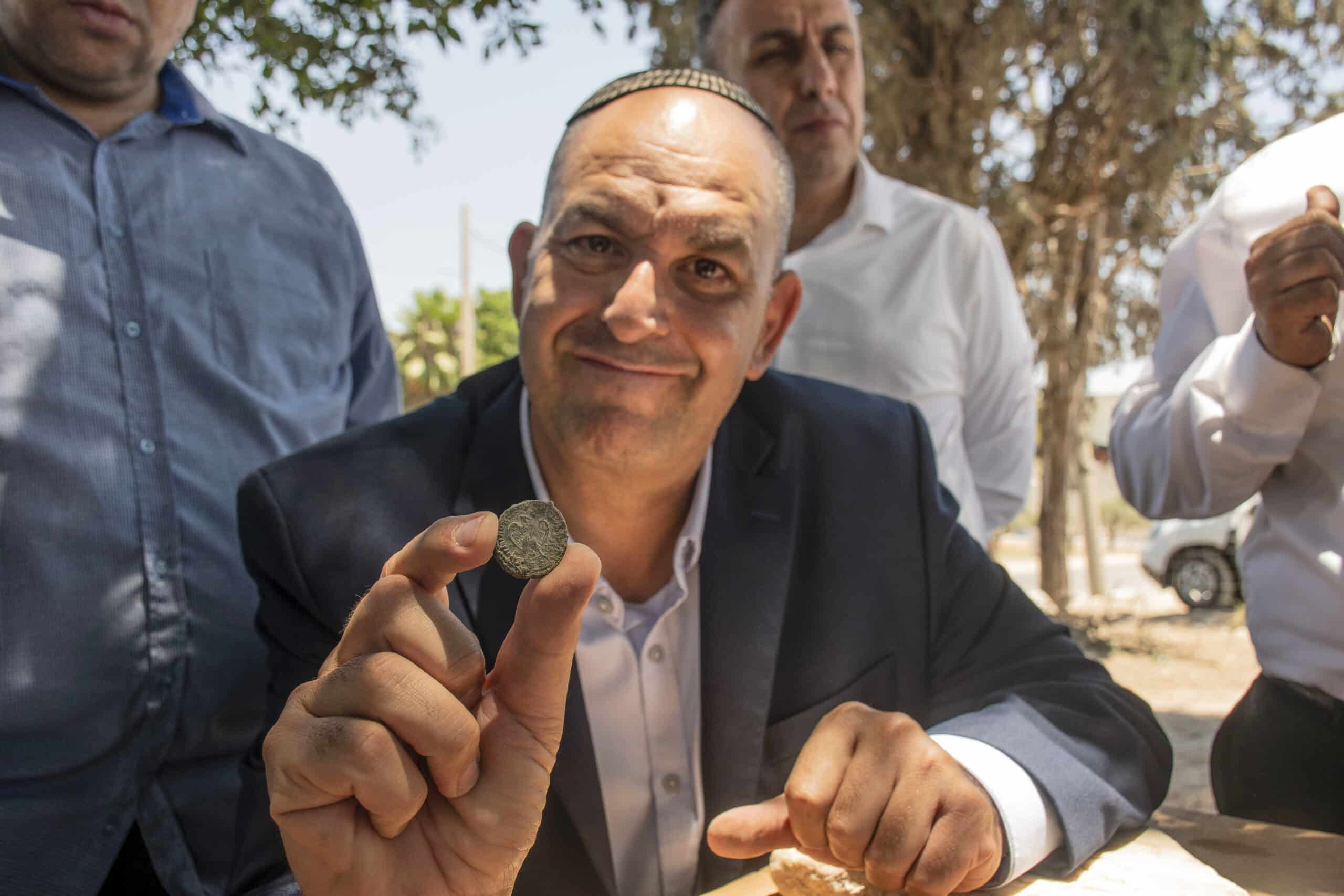 יאיר רביבו עם מטבע שהתגלה בחפירת המבנה.צילום יולי שוורץ רשות העתיקות