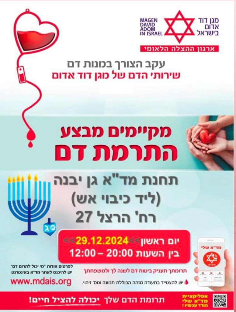 מבצע התרמת דם בגן יבנה עקב הצורך הדחוף במנות דם.