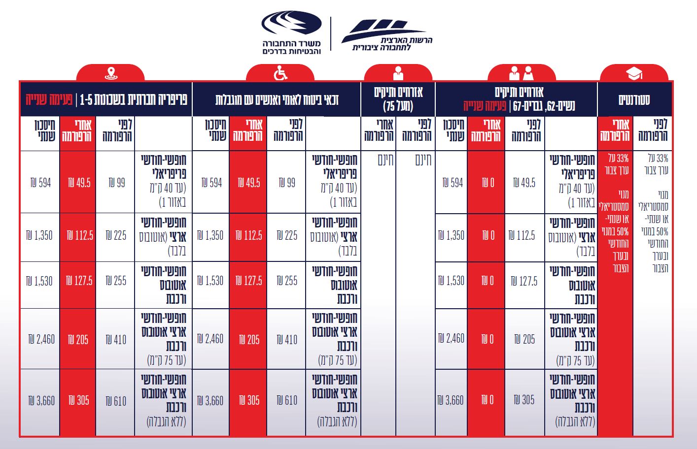 תושב הפריפריה יוכל לחסוך בשנה בין 594 שקלים (50% הנחה על חופשי חודשי אזור 1) ועד 3,660 שקלים לנסיעות חינם בכל רחבי הארץ (50% הנחה על חופשי חודשי ארצי הכולל רכבת בעלות של 305 ש"ח במקום 610 שקלים).