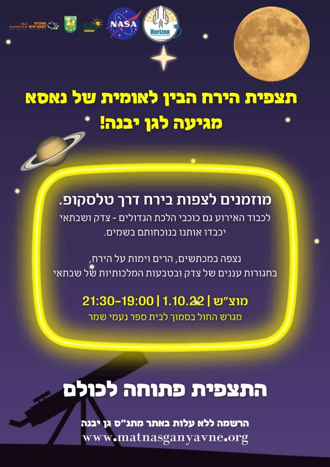 המועצה המקומית גן יבנה לקחה במוצאי שבת האחרון (1.10) חלק במיזם בין לאומי של חברת החלל האמריקאית נאס"א לתצפית ירח בין לאומית עם מאות אלפי משתתפים ברחבי העולם כולו.