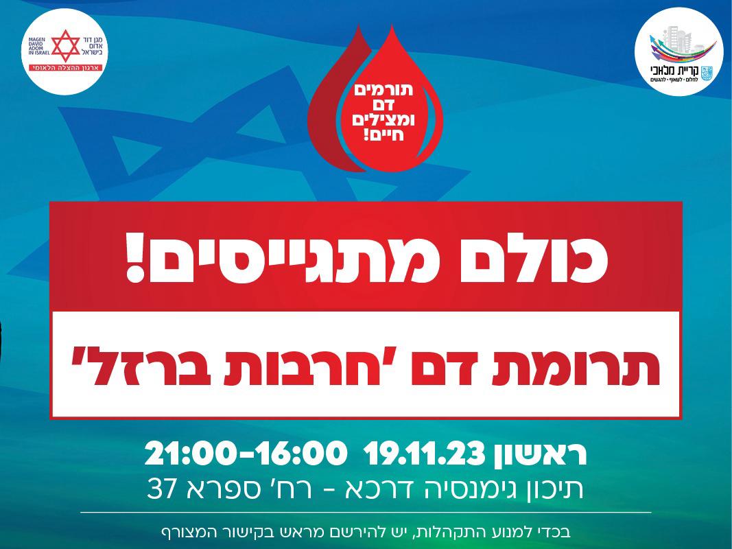 תורמים דם ומצילים חיים במלחמת חרבות ברזל! מתי? ראשון, 19.11.23 בין השעות 16:00-21:00