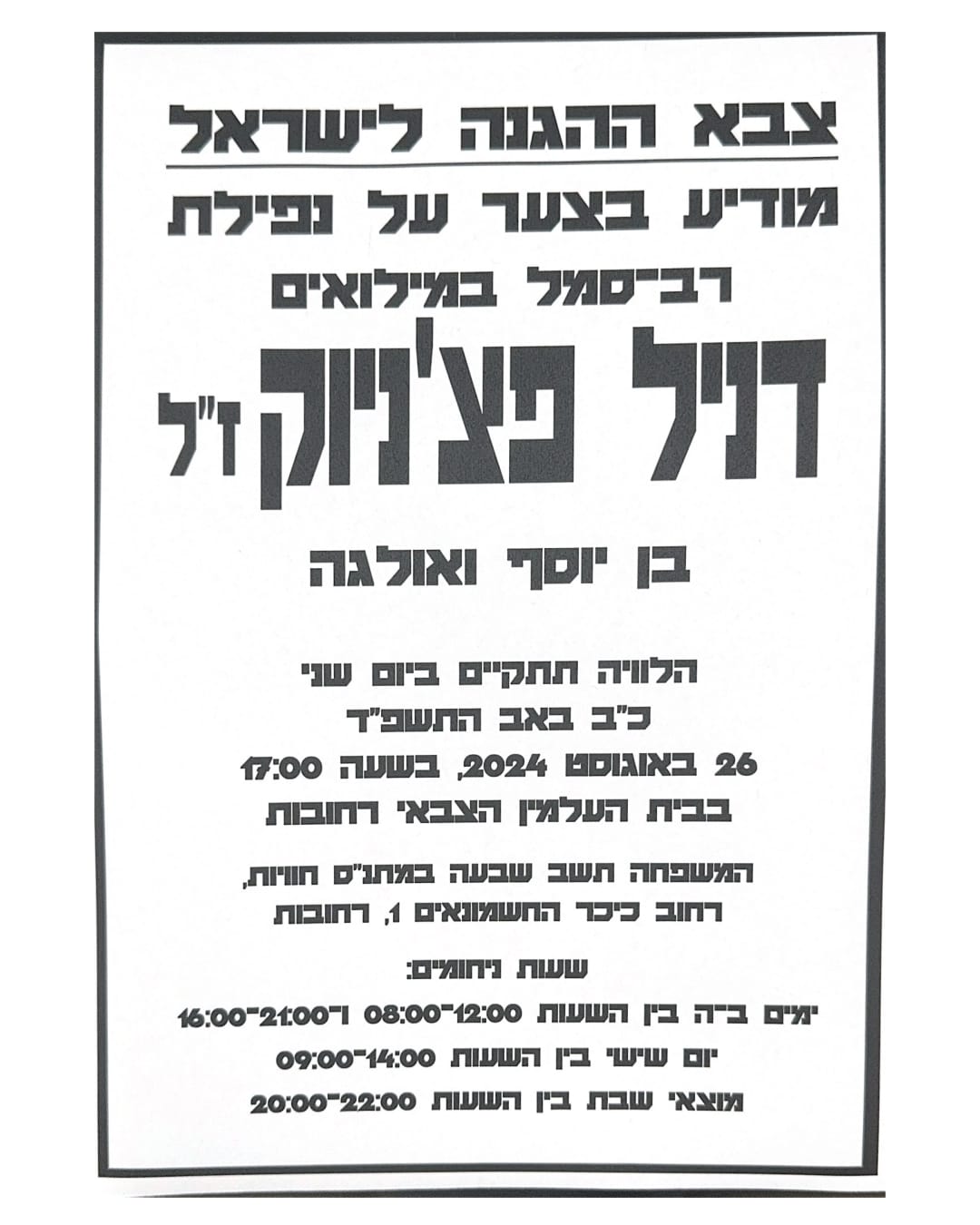 לוחם המילואים, רס"ל דניל פצ'ניוק, רק בן 26 שנפל בקרב ברצועת עזה, יובא למנוחות היום בשעה 17:00 בבית הקברות ברחובות.
