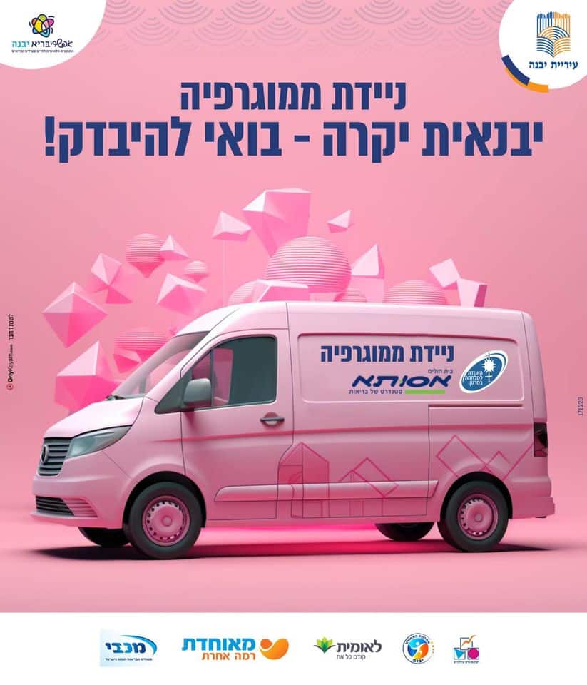 ביום ראשון 24.12.23 בין השעות 08:00-18:00 וביום שני 25.12.23 בין השעות 07:30-17:00 תוצב ניידת לבדיקת ממוגרפיה ברחבת החנייה האחורית של היכל התרבות, שד׳ דואני פינת ז׳בוטינסקי 3, יבנה.
