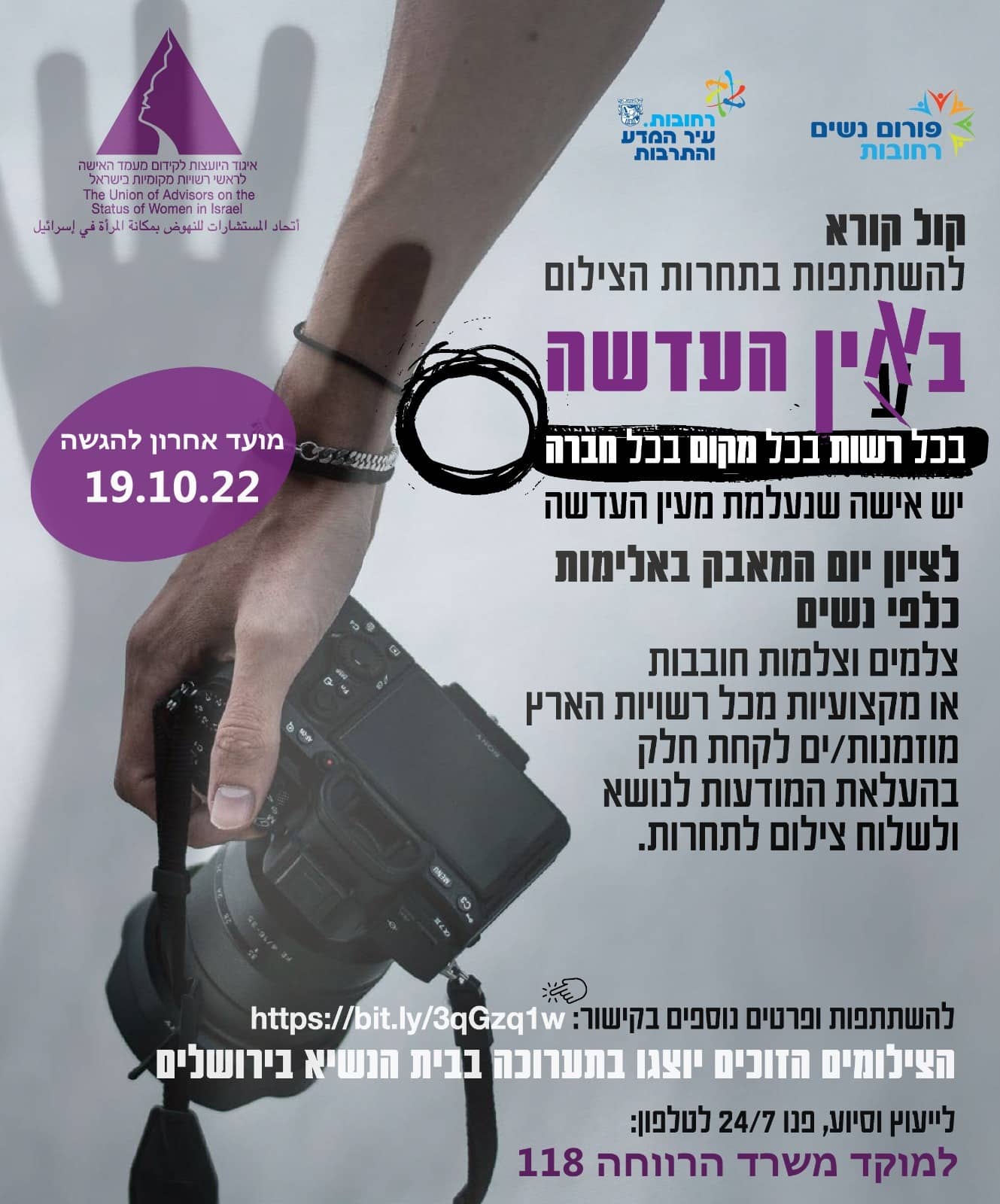 נלחמים באלימות כלפי נשים: עיריית רחובות מצטרפת לתחרות הצילום הארצית באין העדשה להעלאת המודעות למאבק כלפי נשים נשים וגברים מוזמנים להגיש צילומים ולהשתתף בתחרות צילום המציגה זוויות שונות של נושא האלימות כלפי נשים עד ליום רביעי 19/10 הצילומים הזוכים יוצגו בתערוכה מיוחדת בבית הנשיא בירושלים