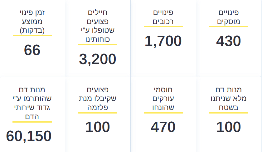 לראשונה בשדה הקרב המודרני, חיל הרפואה מצייד את הרופאים המלווים את הכוחות בתוך רצועת עזה במנות "דם מלא", זאת כדי לאפשר מתן מנות אלה לפצועים סמוך ככל הניתן לנקודת הפציעה, בעיתוי שבו הוא הכי משמעותי עבור הפצועים. דם מלא הוא נוזל ההחייאה הטוב ביותר שקיים כיום, והשימוש בו במלחמה הוא תוצאה של תהליך ארוך שקיים חיל הרפואה בצה"ל בשיתוף עם בנק הדם.