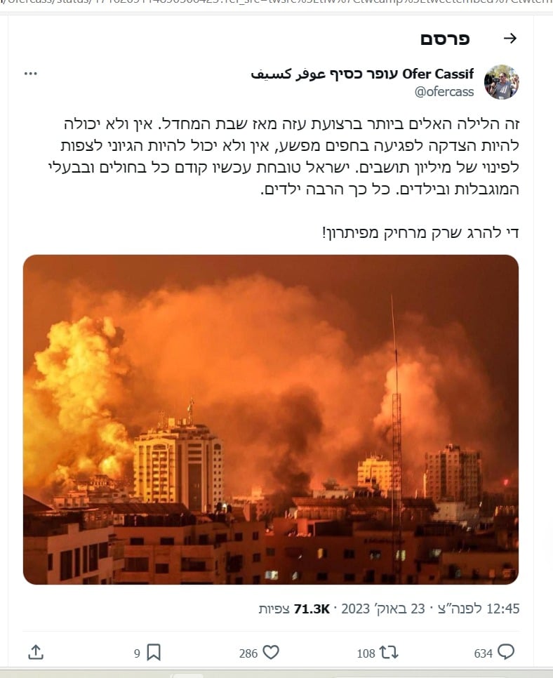 חה"כ עופר כסיף צייץ באוקטובר האחרון בחשבון ה-X (טוויטר לשעבר) ש*"ישראל טובחת עכשיו קודם כל בחולים ובבעלי המוגבלות ובילדים. כל כך הרבה ילדים. די להרג שרק מרחיק מפיתרון!" – ובעקבות כך, ארגון זכויות האדם בצלמו הגיש תלונה לוועדת האתיקה של הכנסת כנגד כסיף.