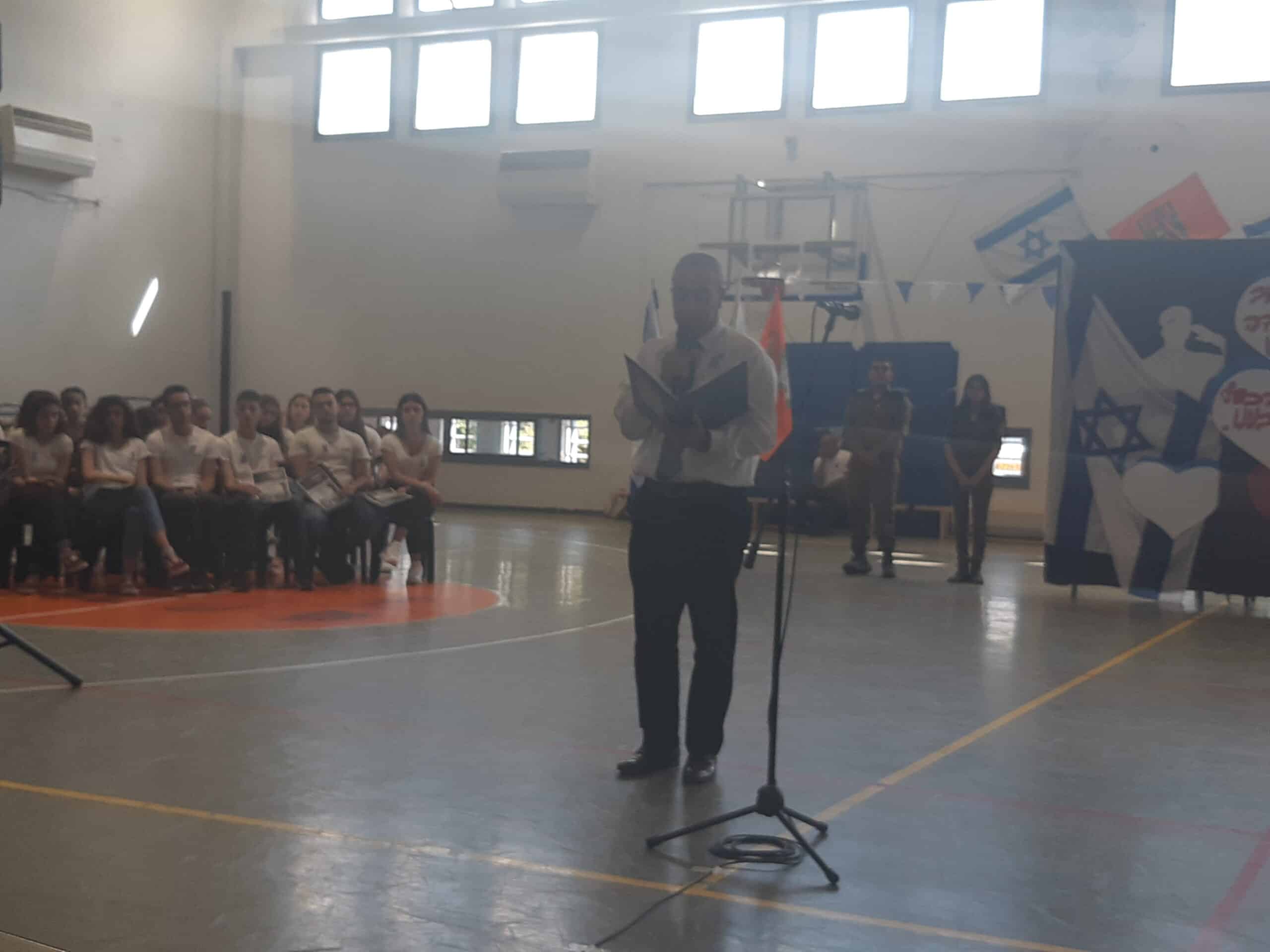 מנהלת בית הספר, מרי שפונט, הקדישה בנאומה את המחויבות של בית הספר לבוגריו שנפלו במערכות ישראל. על הבמה עלו תלמידים שספדו לנופלים מבית הספר. ברק רפאל דגורקר ז"ל בנם הבכור של משה ואורה שנפל במלחמת צוק איתן בן 27 בנפלו, נתנאל ממן ז"ל בנם של שלמה ורבקה ממן בן 21 בנפלו, אלפי רועי ישראל ז"ל שנפל בשנת 2013 בן 19 בנפלו, עמרי שושן ז"ל שנפל בפעילות מבצעית ב-2010 בן 20 בנפלו, המורים והתלמידים הדליקו נרות נשמה והניחו דגלים בגלעד שהוקם בחצר בית הספר. תלמידים רבים מחו דמעת והתרגשו מאוד במהלך הטקס.