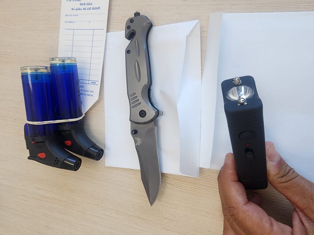 במהלך החיפוש שביצעו השוטרים, נדהמו לגלות בתיקו של הילד ארסנל של ממש: סכין, שוקר חשמלי ושני מבערים. החשוד הובא באופן מיידי לחקירה בתחנת המשטרה, שם נבדק הרקע למעשיו והאם קיימים אירועים קודמים בהם היה מעורב.