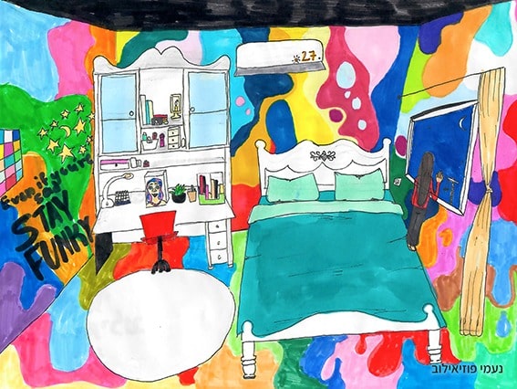 תלמידי ותלמידות בית ספר יחזקאל באשקלון פותחים חלון לעולמם הפנימי תוך ביטוי ויזואלי דרך ציורים לקולות הפנימיים של הפחדים והחרדות אל מול קולות המלחמה