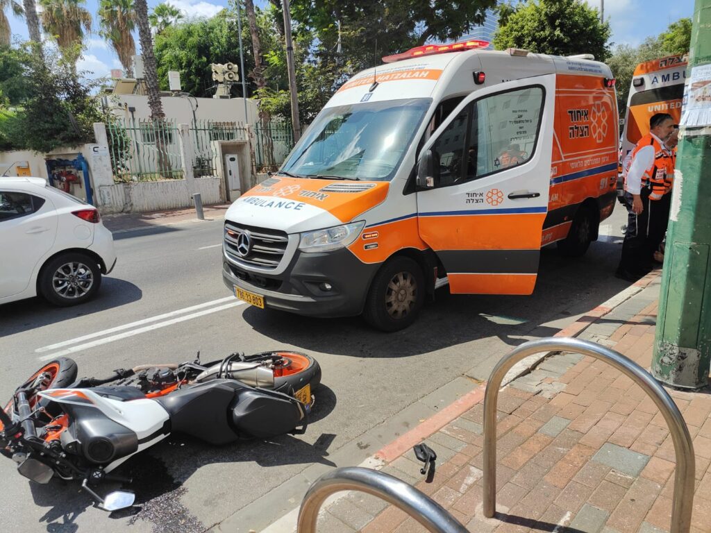 תאונה עם מעורבות רכב ואופנוע אירעה ברחוב הברזל בתל אביב.