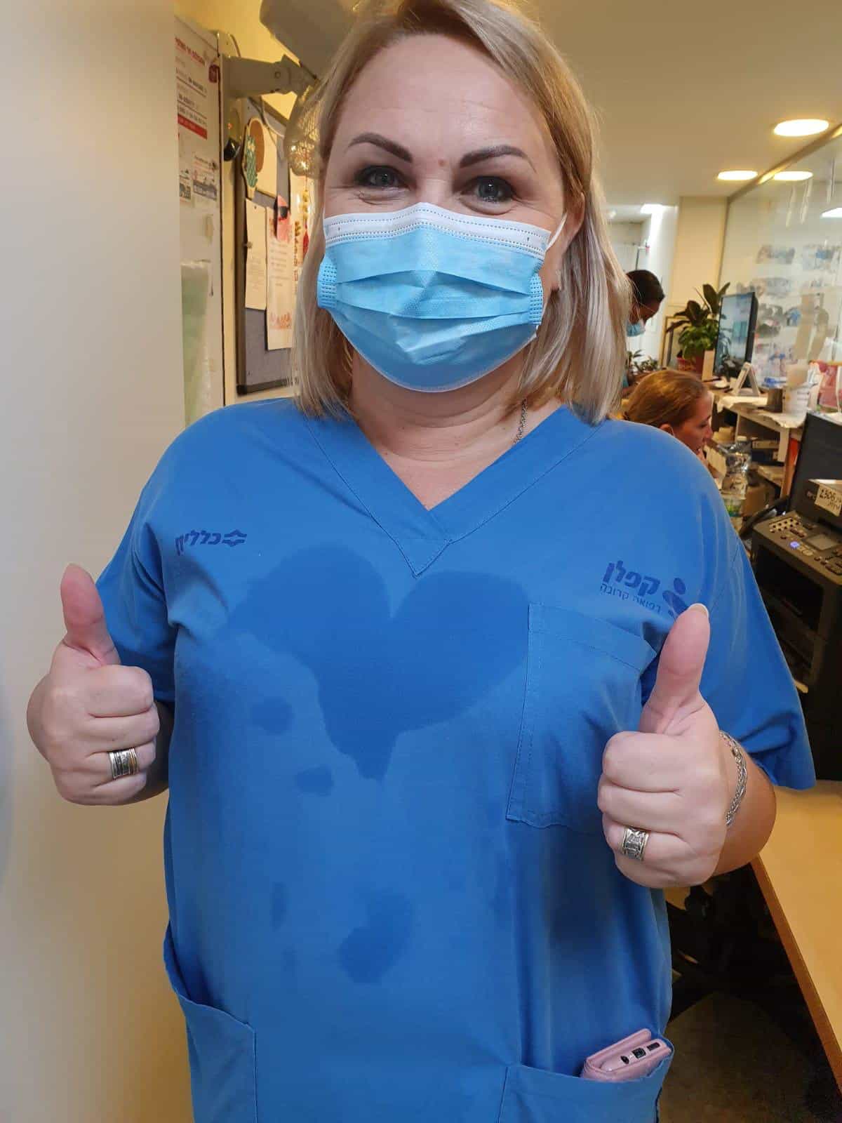 לינה טטייבסקי, אחות בכירה במחלקת קורונה, ביה"ח קפלן, אחות מזה 22 שנה, מתוכם 15 שנים בקפלן, קיבלה הערה מאנשי הצוות הרפואי לאחר עבודה קשה ומיוזעת במהלך משמרת על צורת לב מקרית על מדי האחות שלה, שהיא ההוכחה הכי אותנטית לעבודה קשה מכל הלב.
