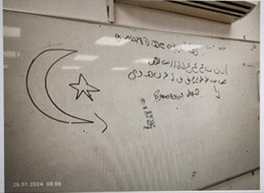 במשטרת ישראל התקבל דיווח ביום שישי האחרון (26/1/24) בשעות הבוקר, אודות כיתוב בשפה הערבית על הלוח בכיתה ולוח השנה, בבית ספר סביונים באור יהודה.