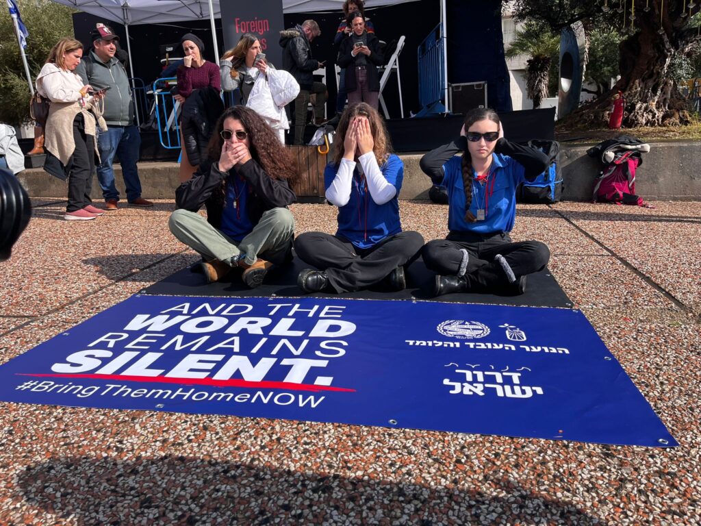תנועת הנוער העובד והלומד מוחה נגד שתיקת העולם בעצרת 100 הימים, לאות הזדהות הקימו מיצג אנושי בכיכר החטופים בסימן "והעולם שותק".