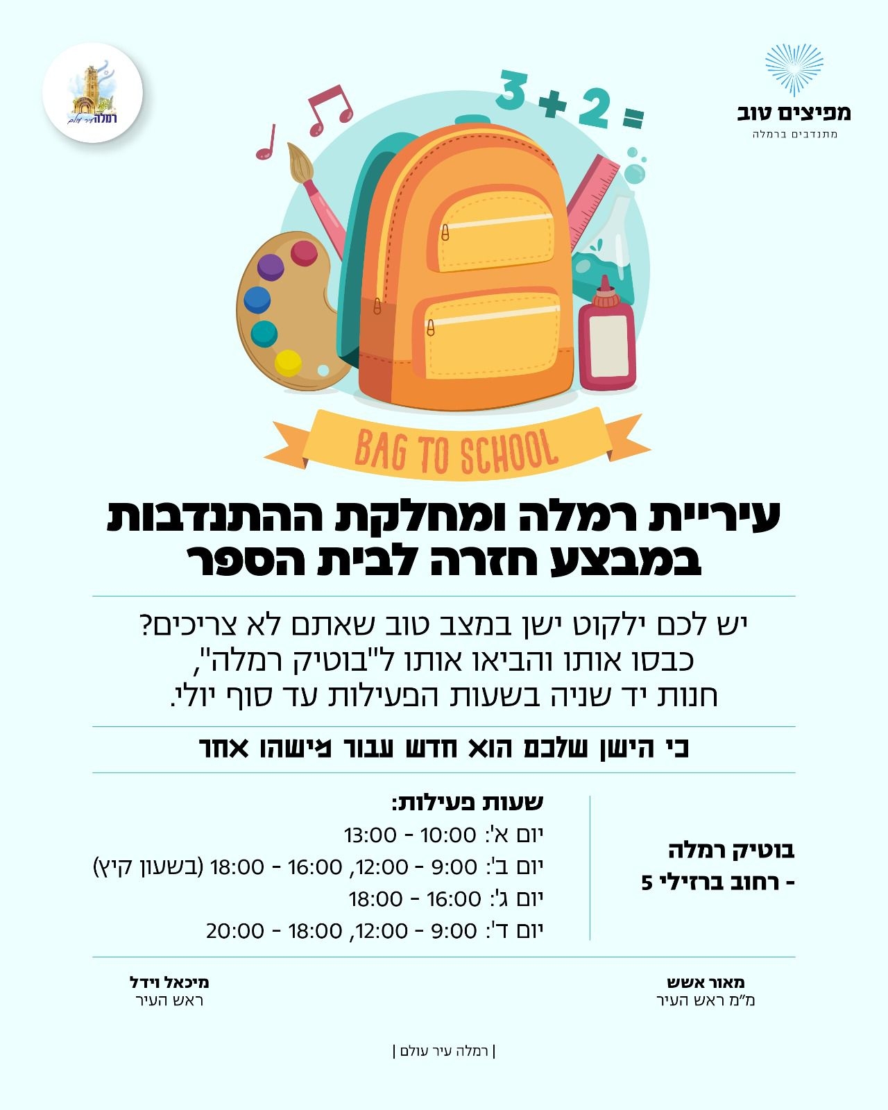 העירייה מזמינה אתכם לכבס את הילקוטים ולהביאם ל**"בוטיק רמלה"**, הממוקם ברחוב ברזילי 5 בעיר. "בוטיק רמלה" פועל למען תושבי העיר ומסייע בחלוקת ציוד ופריטים נחוצים למשפחות ולילדים. תרומתכם תאפשר לילדים נזקקים לפתוח את שנת הלימודים עם ילקוט ראוי, תקין ואסתטי.