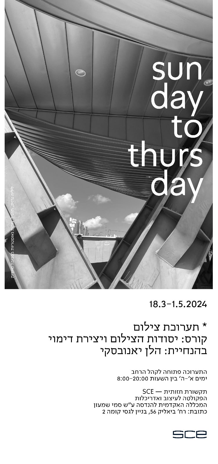 המחלקה לתקשורת חזותית, במכללה האקדמית להנדסה ע״ש סמי שמעון SCE, מציגה עד ל-1.5.24 בימים א'-ה' בין השעות 8:00-20:00. תערוכה מיוחדת של סטודנטים שנה א׳ בקורס יסודות הצילום ויצירת דימוי, בהנחיית המרצה הלן יאנובסקי.