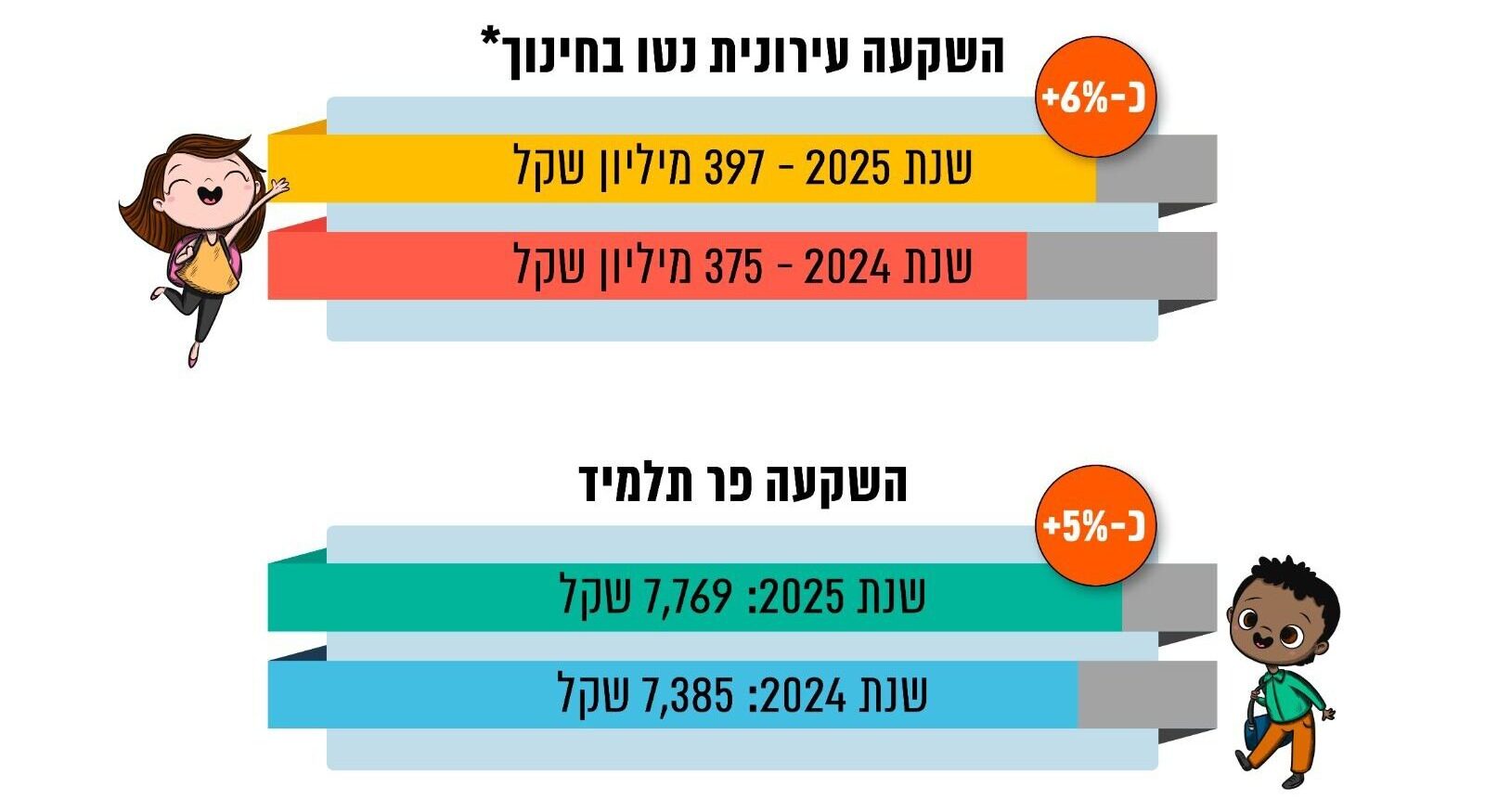 –תקציב החינוך יעמוד על 38% מסך התקציב הכולל – כ-1.119 מיליארד שקל, כאשר ההשקעה העירונית בחינוך נטו תגדל בכ-25 מיליון שקל ותעמוד על כ-397 מיליון שקל. ההשקעה בכל תלמיד ותלמידה בשנת 2025 תעמוד על כ-7,769 שקל לתלמיד – עלייה של 5%, זאת לעומת ההשקעה בתלמיד בתקציב 2024. הדבר מבטא את מחויבות העירייה להמשיך ולהוביל את החינוך בישראל ולהכשיר את תלמידות ותלמידי העיר לאתגרי המחר. כמו כן, ההוצאות לפעולות החינוך יסתכמו בכ-420 מיליון שקל – גידול של כ-17 מיליון שקל מול התקציב המאושר ל-2024.