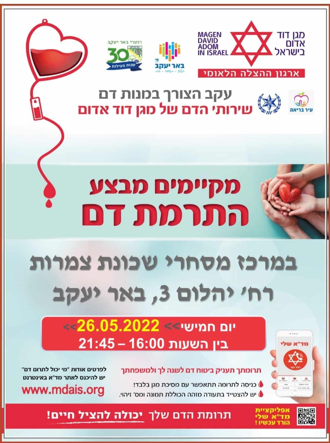 עקב הצורך במנות דם, מקיימים שירותי הדם של מגן דוד אדום, התרמות דם בכל רחבי הארץ. התרמת דם בבאר יעקב, תתקיים ביום חמישי, 26/5/2022 בין השעות 16:00-21:45