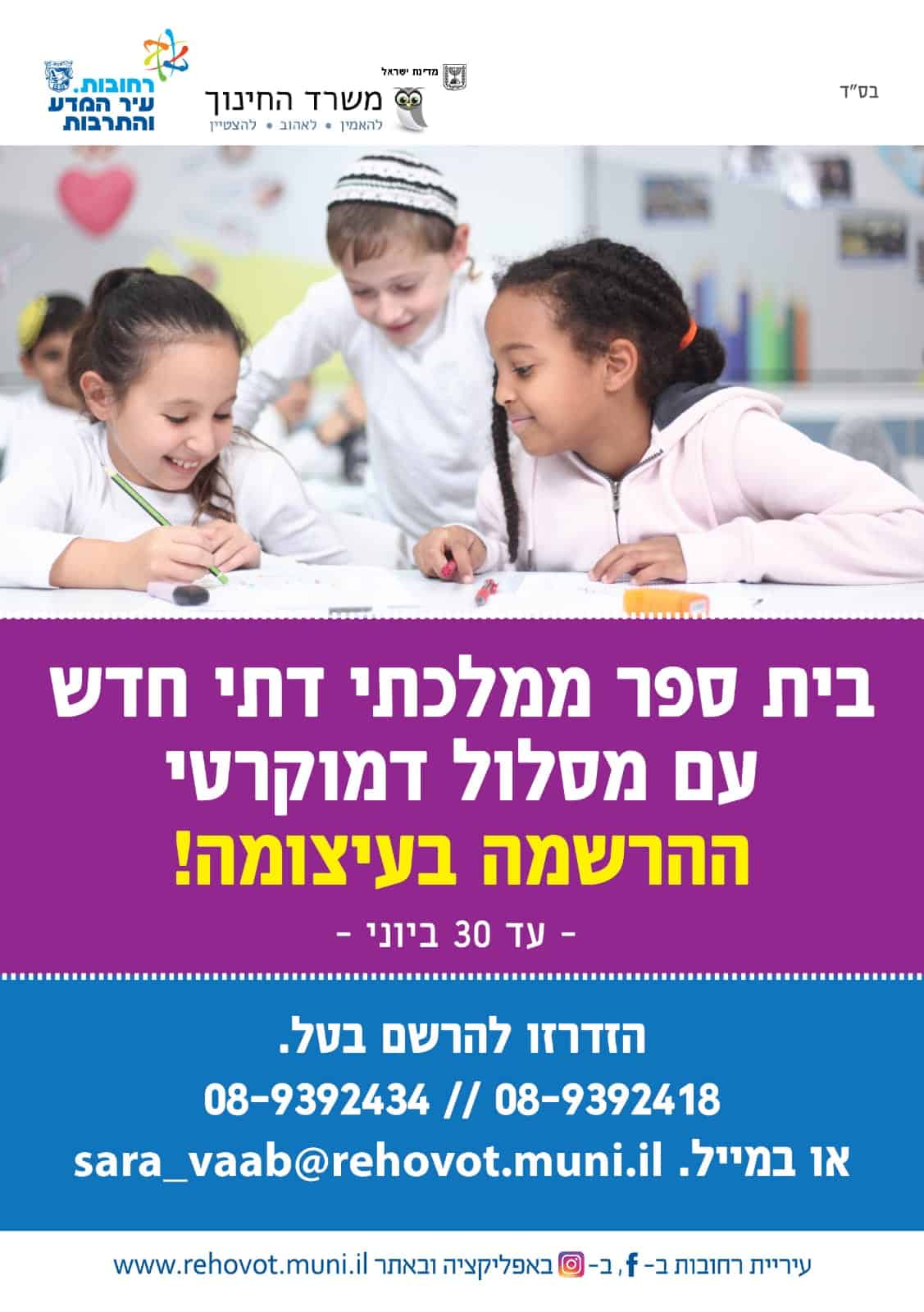 עיריית רחובות פותחת בפני ההורים בחינוך הממלכתי דתי מסלולים מגוונים, ביניהם ייפתח בית ספר ממ"ד חדש, הכולל מסלול דמוקרטי. המועד האחרון להרשמה: 30.6.