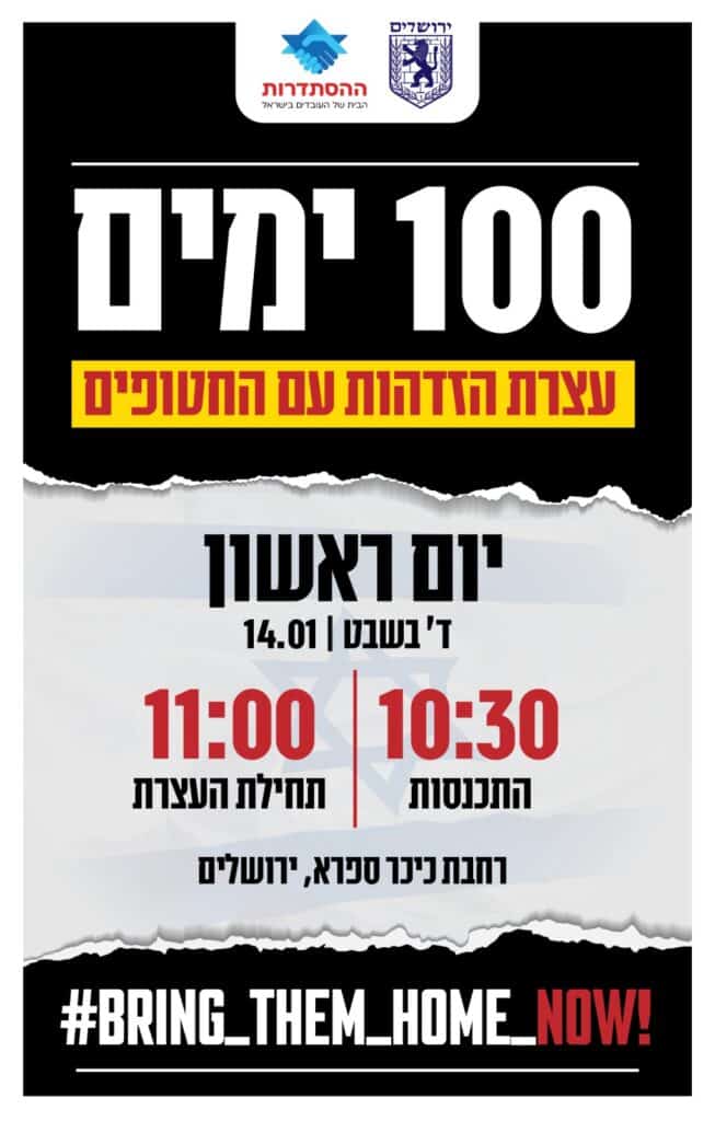 עצרת הזדהות עם החטופים שתתקיים ביום ראשון – ד' בשבט – 14.01.24 ברחבת כיכר ספרא, ירושלים. התכנסות בשעה 10:30 – תחילת העצרת בשעה 11:00. מוזמנים ומוזמנות להשתתף