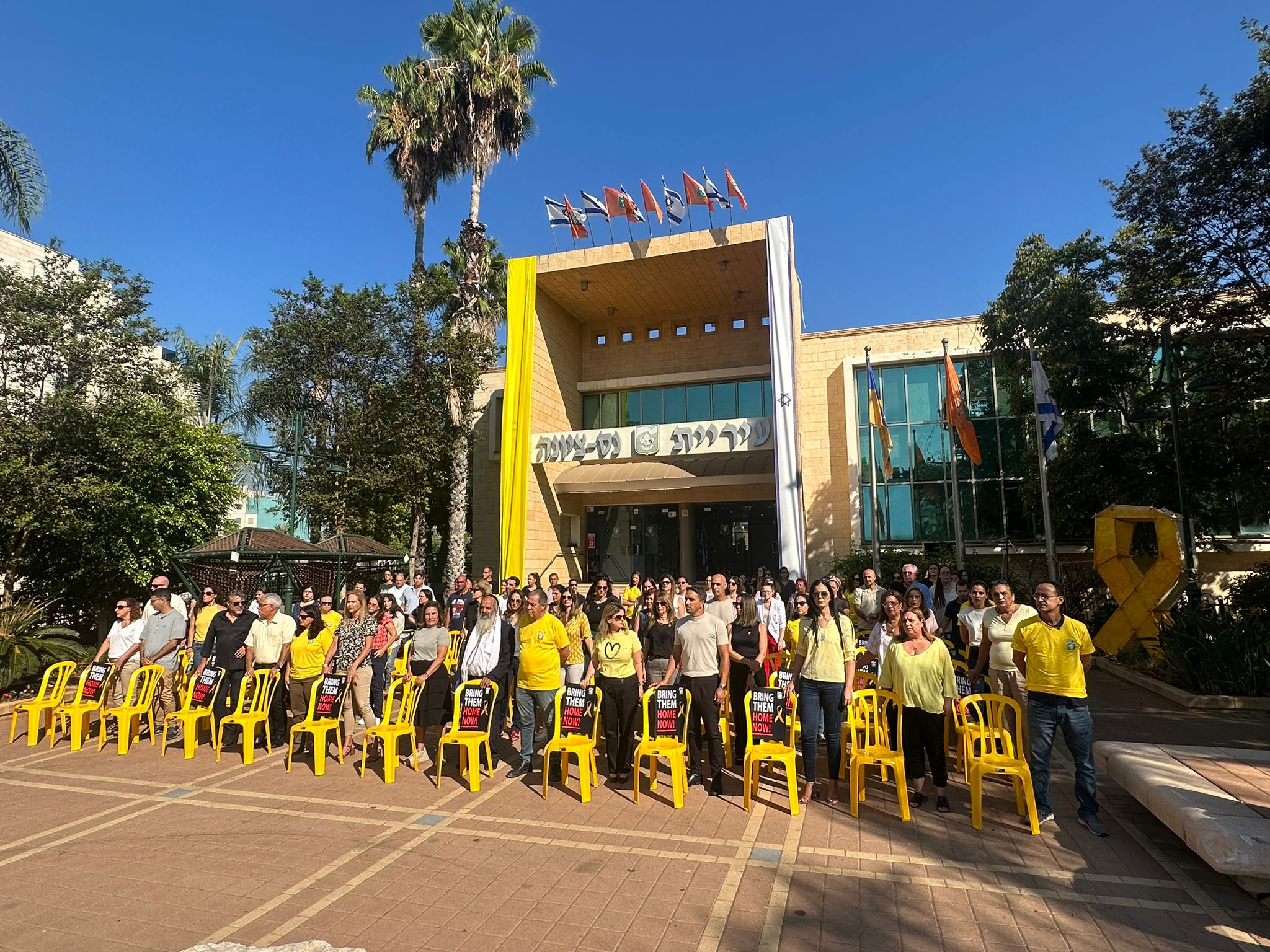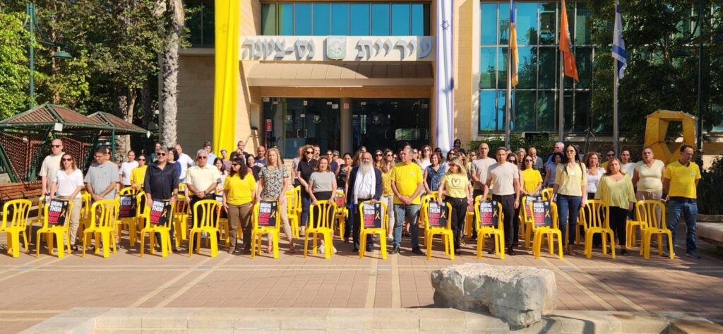 לאות הזדהות עם המאבק להשבת החטופים – ברחבת עיריית נס ציונה הוצבו הבוקר 101 כיסאות צהובים עליהם הכיתוב BRING THEM HOME NOW. ראש העיר שמואל בוקסר, סגני ראש העיר, מנהלי – עובדות ועובדי העירייה עמדו לצד הכיסאות הריקים- בקריאה להשבת החטופים הביתה במהרה – ושרו יחד את שירת התקווה.