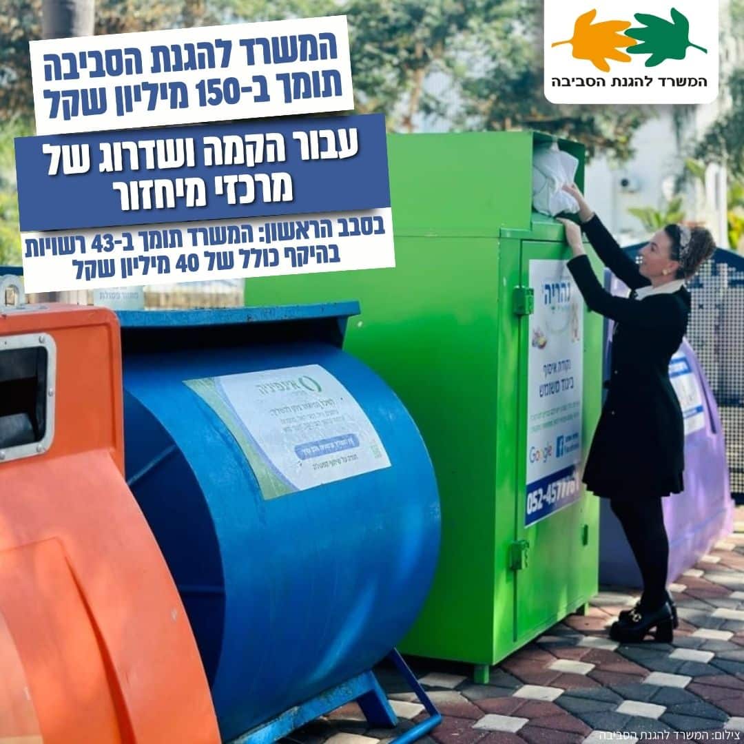 המשרד להגנת הסביבה בראשות השרה עידית סילמן, תומך ברשויות המקומיות ובמועצות האזוריות בסכום כולל 150 מיליון שקל עבור הקמה ושדרוג של מרכזי מיחזור, מצפון הארץ ועד לדרומה