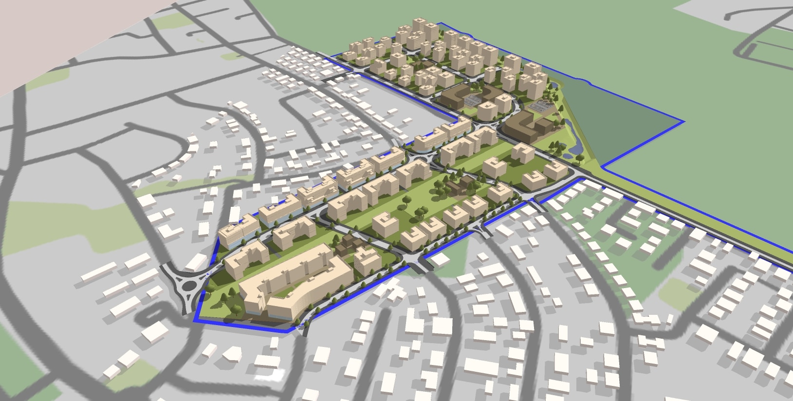 הבינוי כולל בניינים נמוכים יחסית, בגובה מדורג המשתנה בין 4-8 קומות בלבד, תוך התייחסות לסביבה ולגובה הבניה הקיימת הגובלת בתוכנית. זאת, תוך הקפדה על התחברות ויצירת רשת תנועה מקיפה עם הרחובות הקיימים, ריבוי שבילים ושטחים ציבוריים נרחבים שיוצרים רצף נעים להליכה.