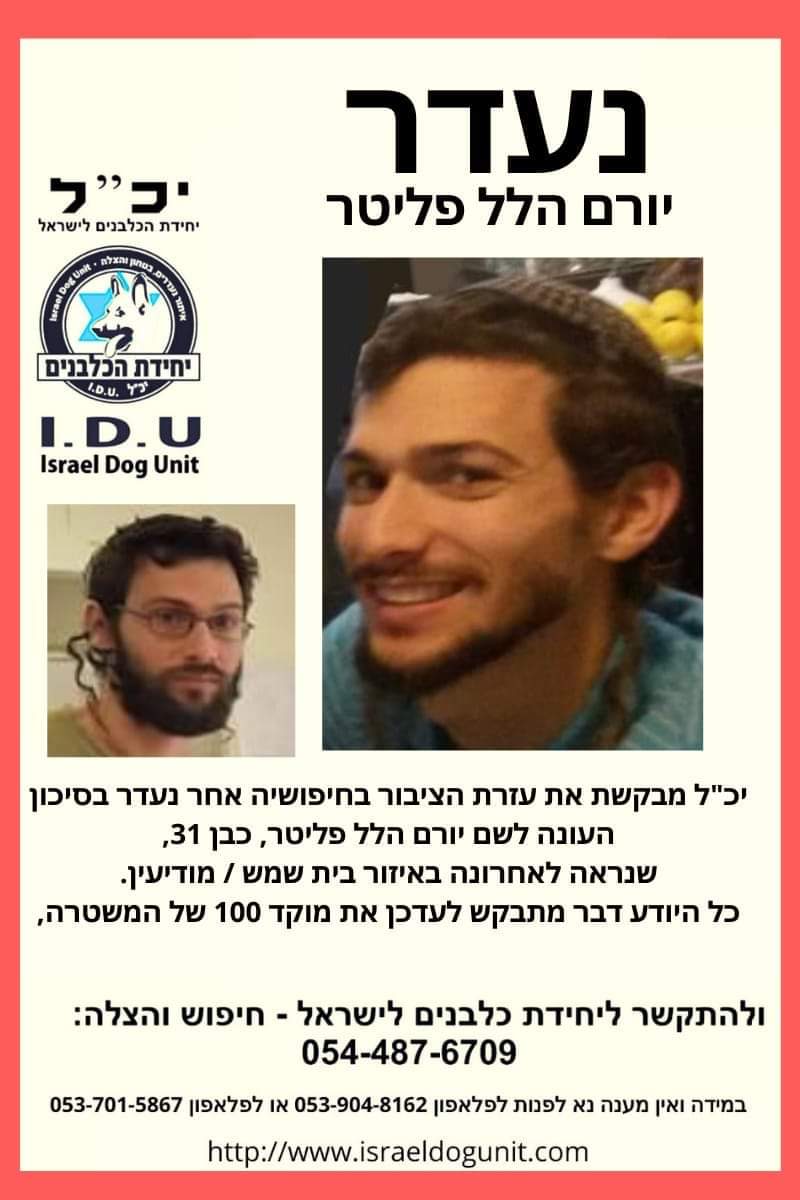 יחידת הכלבנים לישראל חידשה את החיפושים תוך הפעלת מיטב האמצעים, אחר הנעדר יורם הלל פליטר, כבן 31 בהיעלמו, שנראה לפני מספר חודשים באזור כביש 375 שבגזרת בית שמש.
