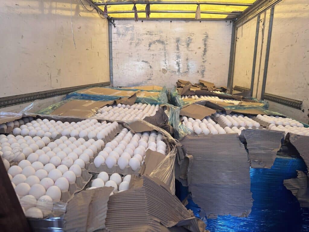 מפקחי היחידה המרכזית לאכיפה וחקירות (פיצו"ח) במשרד החקלאות, בשיתוף מג"ב עוטף ירושלים, תפסו אתמול במחסום א-זעים מזרחית לירושלים, משאית עמוסת ביצים למאכל, חתומות בחותמת מזויפת. הביצים יועדו לשיווק במרכז הארץ. לא נמצא כל תיעוד אודות מקורן של הביצים והן הובלו ללא קירור. המשאית והביצים הוחרמו, והביצים הועברו ללהשמדה לנוכח הסכנה לבריאות הציבור. נגד הנהג החשוד נפתחו הליכים משפטיים.