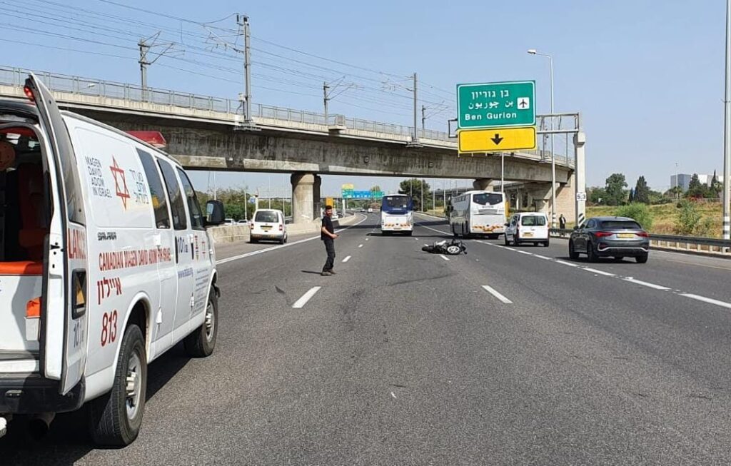 בשעה 09:23 התקבל דיווח במוקד 101 של מד"א במרחב איילון על ת.ד בין רכב לאופנוע עם 2 רוכבים בכביש 1 ממחלף לוד למחלף נתב"ג. חובשים ופראמדיקים של מד"א מעניקים טיפול רפואי ומפנים לבי"ח 2 פצועים באורח בינוני, בהם גבר בן 48 עם חבלות בחזה ובאגן לבי"ח שיבא בתל השומר וגבר בן 23 עם חבלות בכל חלקי גופו לבי"ח שמיר-אסף הרופא.