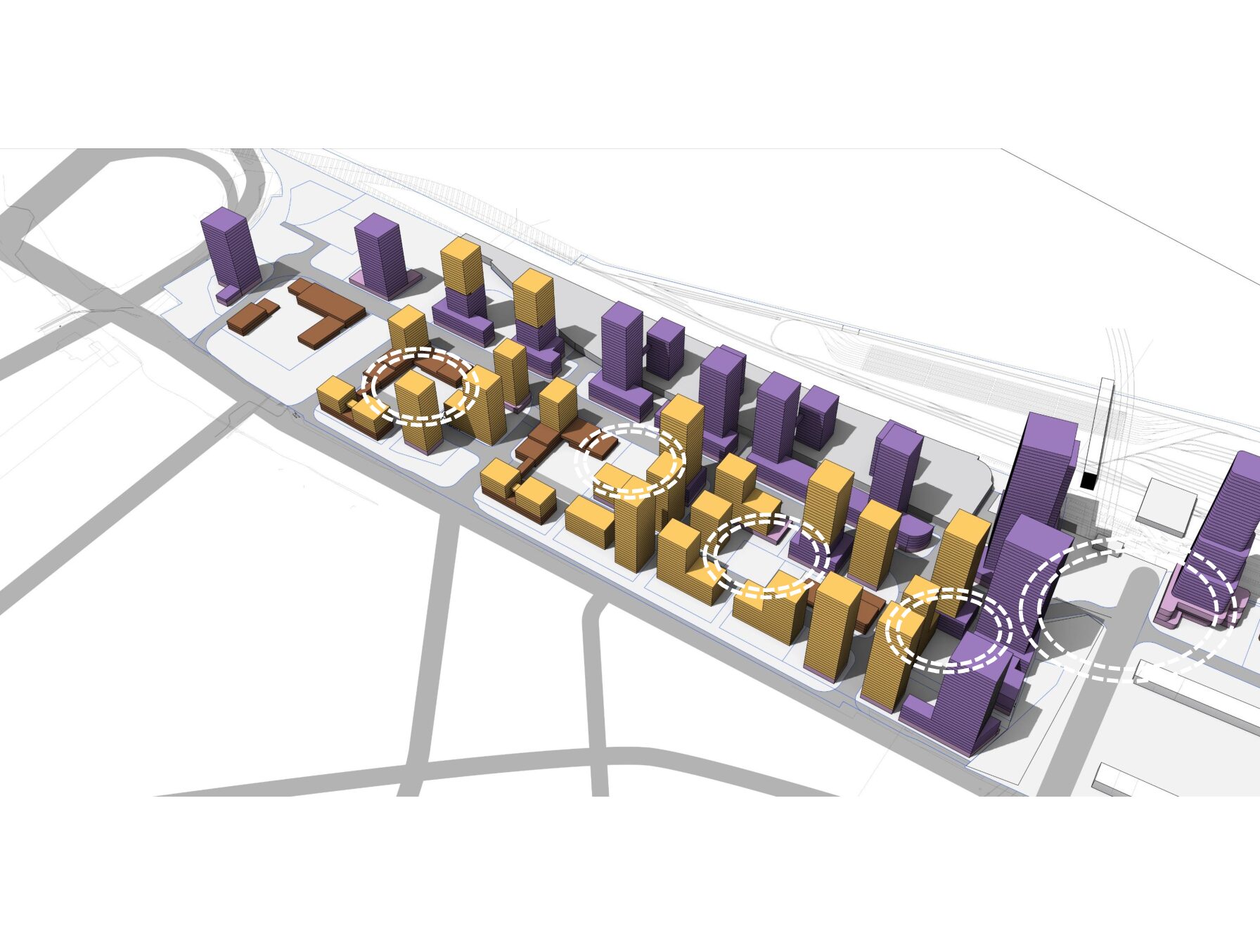 במסגרת זו מוצעות בתכנית 3,700 יחידות דיור, 880 אלף מ"ר לתעסוקה, 27 אלף מ"ר למסחר, וכן כ-150 דונמים שיוקצו למבני ציבור ושטחים פתוחים. במרכזו של המתחם יוקם מוקד תחבורתי משמעותי הכולל תחנת רכבת קלה, רכבת ישראל, מסוף אוטובוסים ותחנת מטרו עתידית.