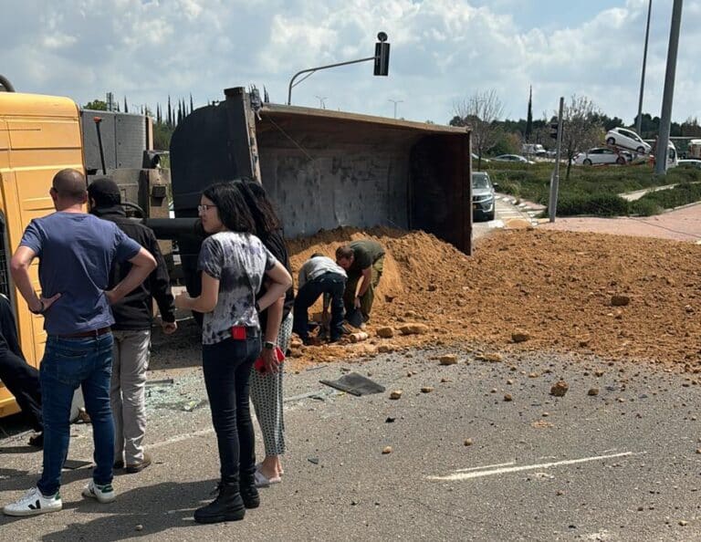 צוותי איילון פועלים לחילוץ נהג משאית שהתהפכה