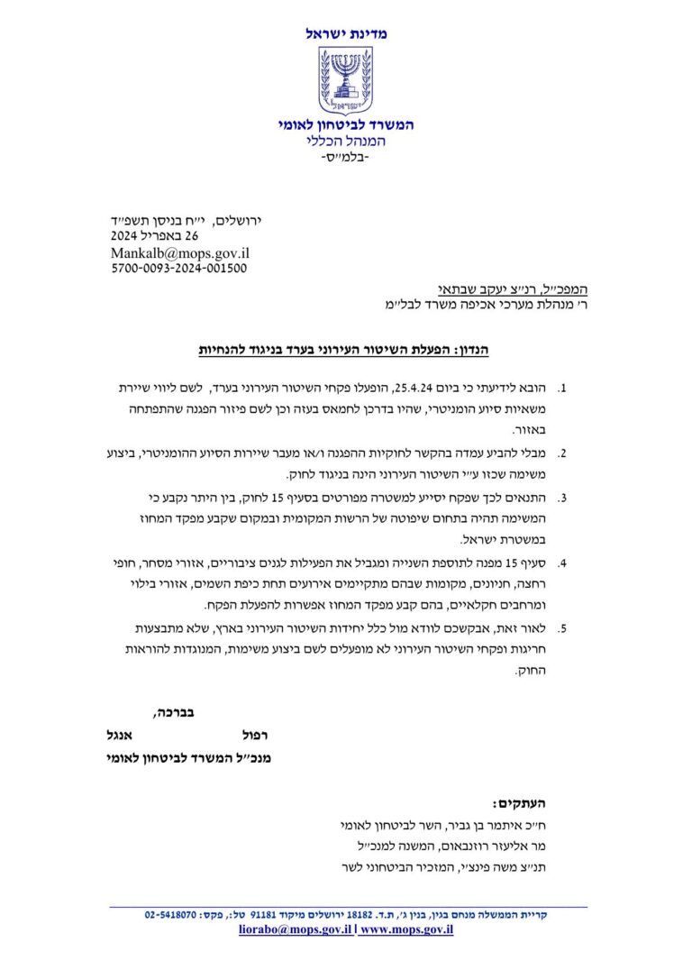 בעקבות דרישת ראש העיר ערד הנחה מנכ"ל המשרד לביטחון לאומי: "לוודא כי השיטור העירוני לא מלווים את שיירות הסיוע ההומניטרי״ 26/04/2024 17:08