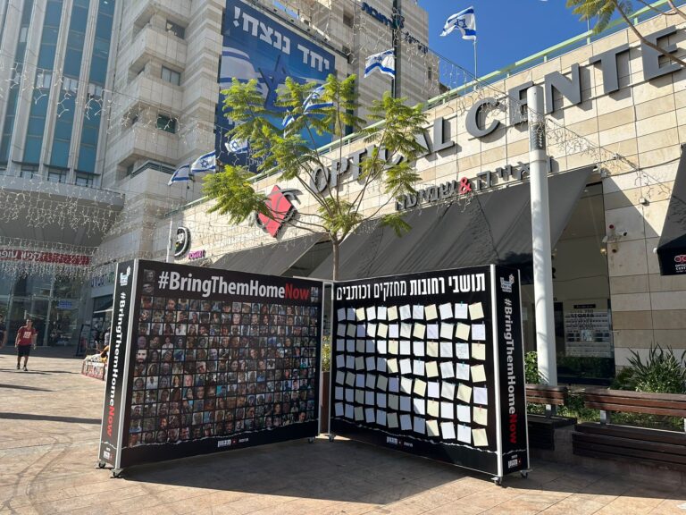 לוחות עם תמונות החטופים הוצבו במקומות מרכזיים בעיר רחובות