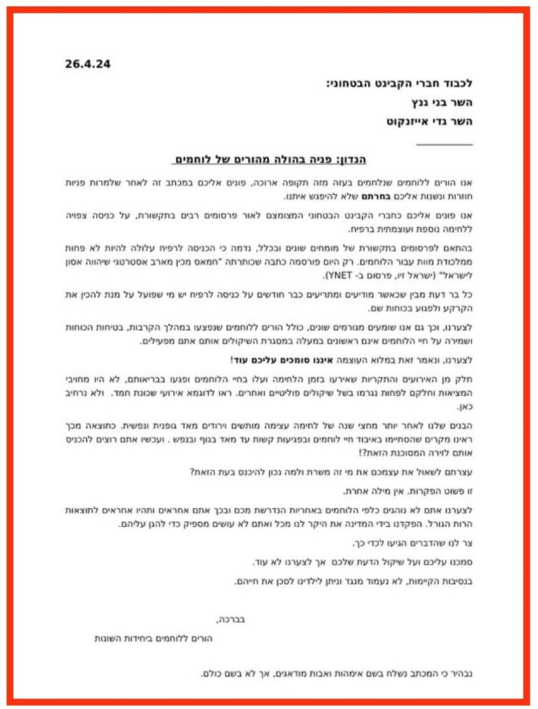 הורים ללוחמים במכתב חריג לגנץ ואייזנקוט: לא נעמוד מנגד וניתן לילדינו לסכן את חייהם ברפיח 29/04/2024 19:55
