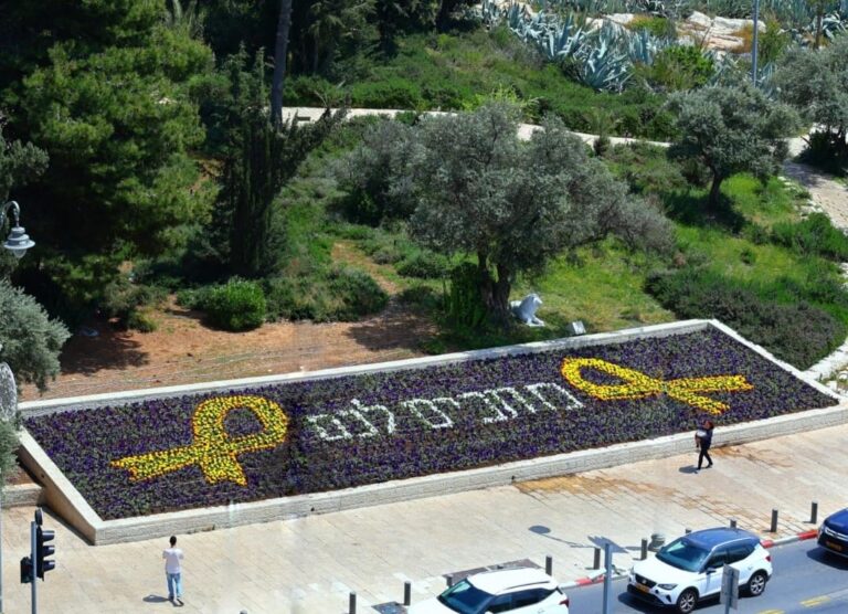 מיצב פרחים צהובים בצורת סמל החטופים הוצב מול גן הפעמון, ירושלים