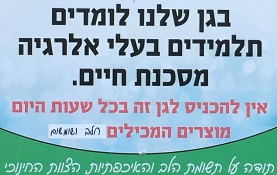 שלטים המדווחים על מוצרים אלרגנים אסורים ניתלו בכניסה לגני הילדים ברחובות; הסיבה: מזעור סכנות מילדים הסובלים מאלרגיות למזון 06/06/2019 22:59