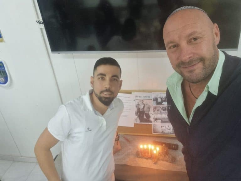 הרב שמעון אייזנבך וסגן ראש העיר סטס דינקין הדליקו נר חנוכה עם מתנדבי ידידים באילת