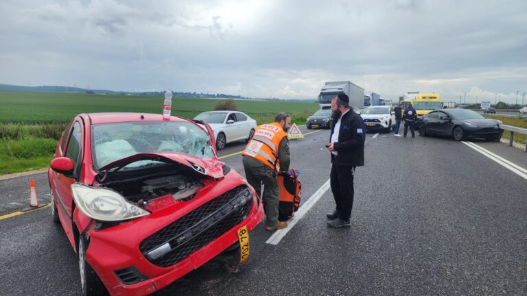 תאונת שרשרת בצומת אמונים: ארבעה פצועים, בהם נהג שנלכד ברכבו